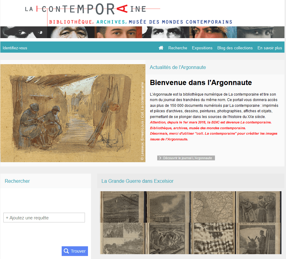 L’Argonnaute est la bibliothèque numérique de La contemporaine et tire son nom du journal des tranchées du même nom. Ce portail vous donnera accès aux plus de 150 000 documents numérisés par La contemporaine : imprimés et pièces d’archives, dessins, peintures, photographies, affiches et objets, permettant de se plonger dans les sources de l’histoire du XXe siècle.