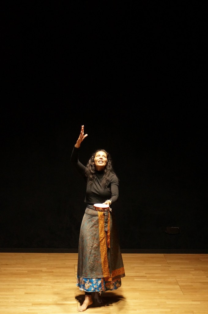 Quand je suis en processus de création, il y a toujours une phase de recherche à partir de contes qui existent déjà. Une fois que le choix est fait, je réécris le conte avec mes propres mots et sonorités. En même temps que j’écris, je réfléchis à la gestuelle. Ensuite, je prépare la mise en jeu. Mais c’est au moment où je joue enfin devant le public qu’il se passe le plus de choses. Je demande toujours à la régie à ce que la lumière soit allumée dans la salle pour que je puisse voir les visages du public. Je laisse une place importante à l’improvisation et l’échange. Par exemple, si une chaise tombe, ou encore…si un camion passe dehors… je tente alors de faire entrer ces petits détails dans le récit. J’interagis beaucoup avec des questions-réponses, par exemple : “Si je vous dit Pronti…. alors répondez-moi Via…”. Je ne suis pas toujours amplifiée, cela dépend de la salle.